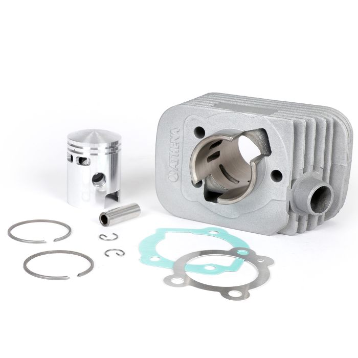 Cilindro Athena in alluminio. Con il suo rivestimento in Nicasil, è un moderno cilindro di ricambio per chiunque voglia rimanere nella gamma dei 50 cc. In sostituzione della semplice installazione plug and play originale o con canali modificati e un carburatore più grande, è anche molto adatto per la messa a punto da 50