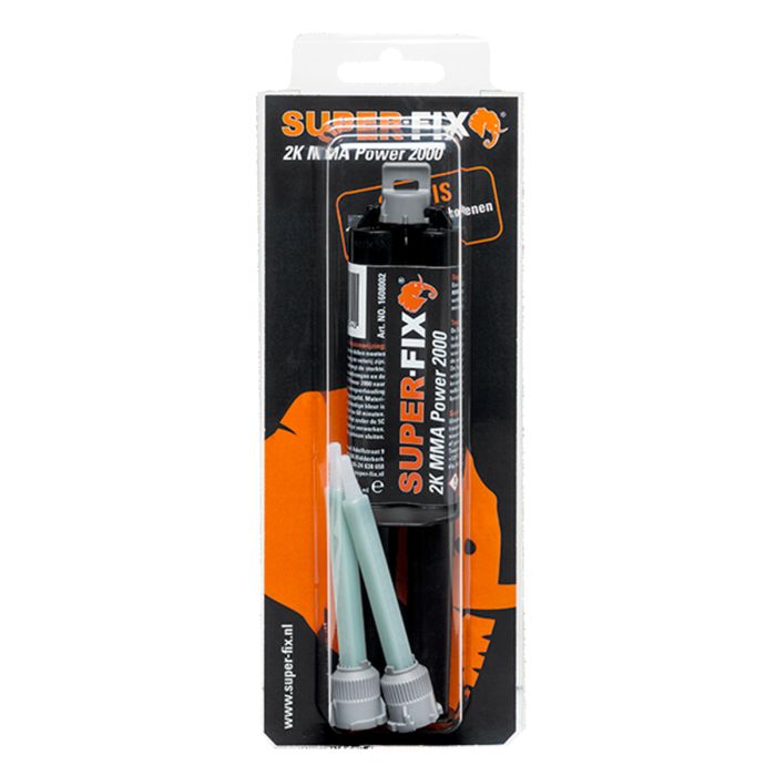 Questo adesivo Super-Fix è la formula 1 tra gli adesivi ad alte prestazioni. Può essere utilizzato laddove tutti gli altri adesivi convenzionali non raggiungono la resistenza desiderata. Il Super-Fix® 2K MMA Power 2000 combina metallo, legno, ceramica e plastica dura per lungo tempo. Dopo la completa polimerizzazione, il sito adesivo può essere trattato e verniciato.